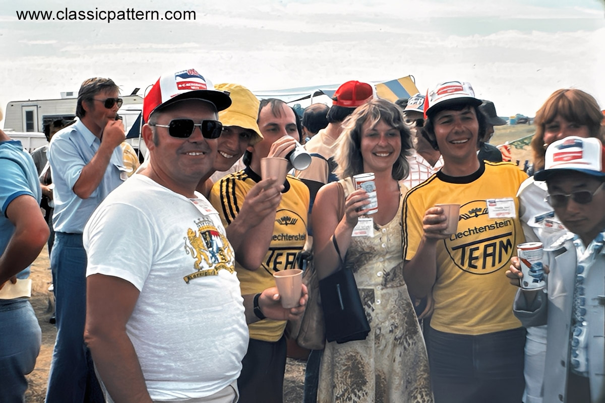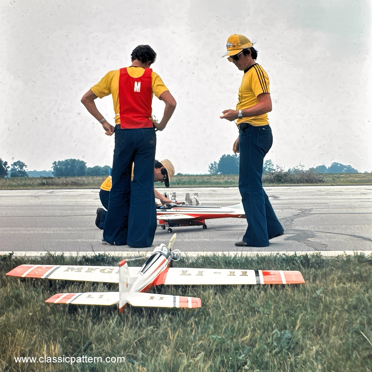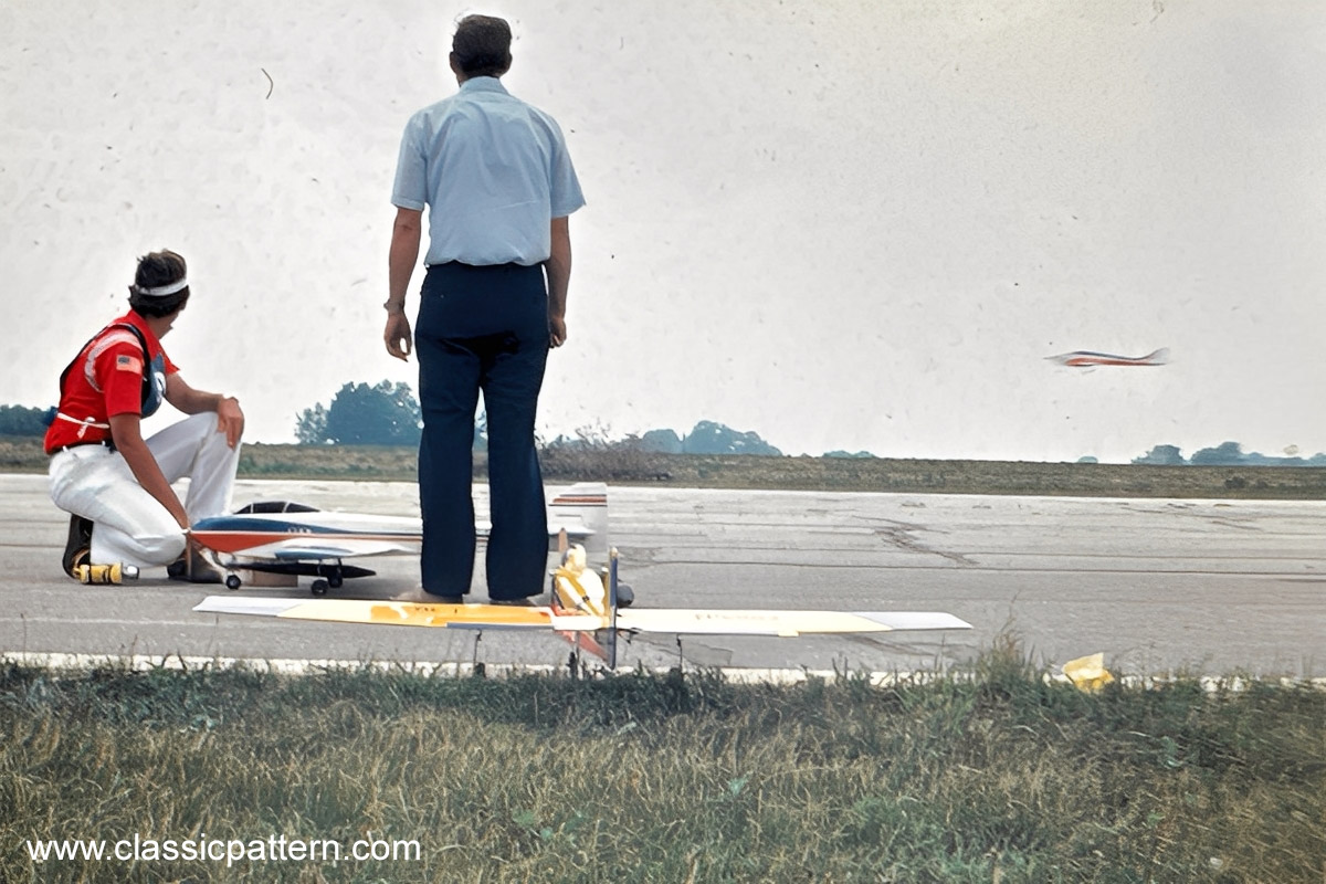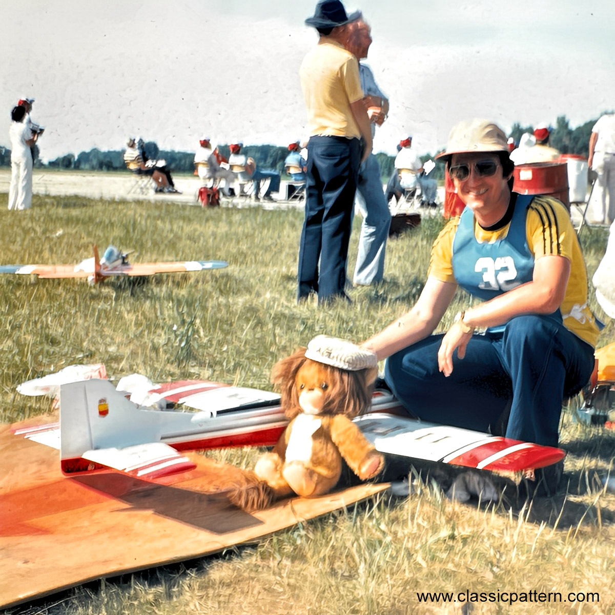 Norbert Matt, Liechtenstein, 23 years old, brother of the great Wolfgang Matt, 8th at the 1975 World Championships in Bern, starts on runway 1 and scores 5025 points. Brian Green, Australia, 42 years old, Australian champion in 1969 and 1973, starts on runway 2 and scores 5355 points with his flight. Ferdinand Schaden, Austria, 42 years old, starts on runway 2 and scores 4670 points. The Dutchman Jan van Vliet, 41 years old, 13 times champion in Holland, starts on runway 1, but his model malfunctions during the flight and even crashes. Van Vliet has to settle for 3915 points.